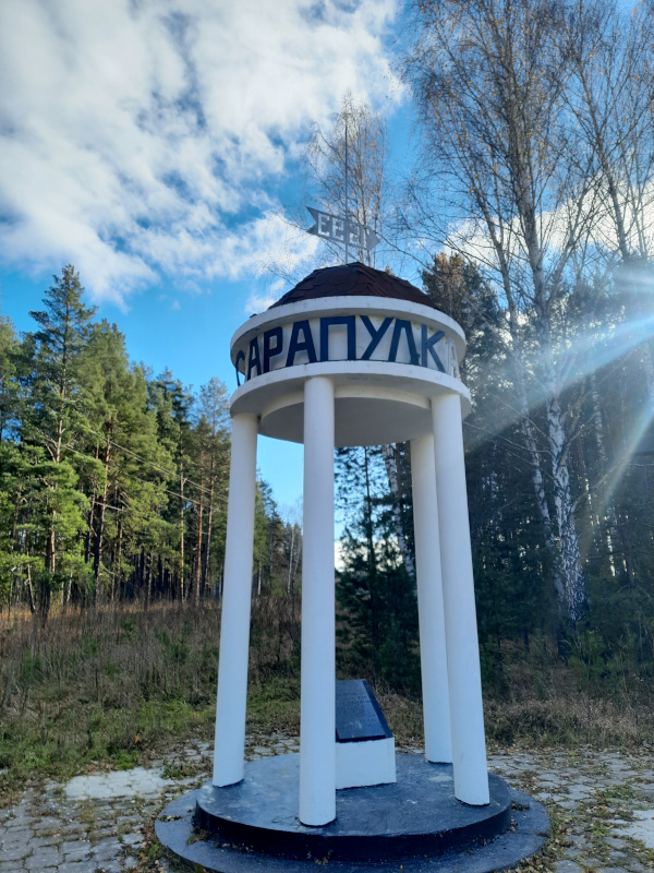 Чуть дальше идет Сарапулка. Поселок в полторы тысячи населения, 1690 года первого упоминания. На въезде беседка. И тоже табличка. Только с аллеей еще хуже.