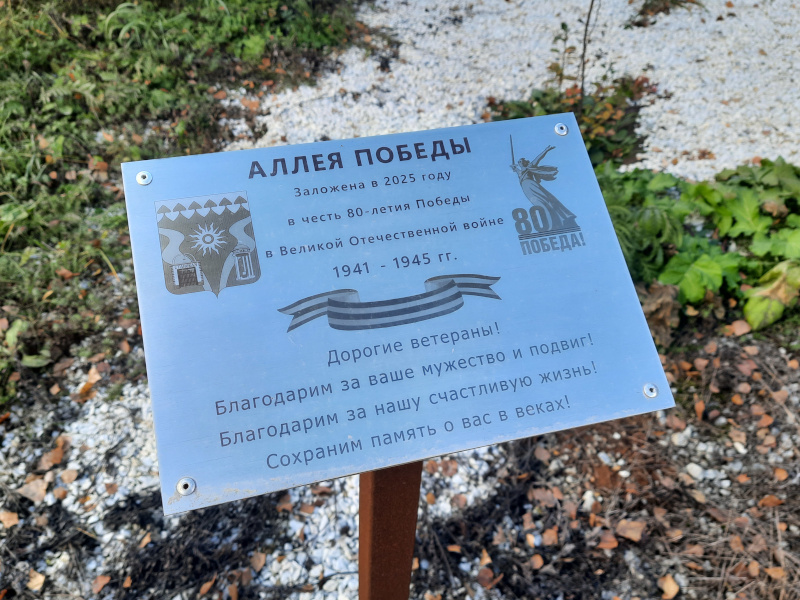 Рядом поклонный крест и табличка в честь высаженной аллеи ветеранов.